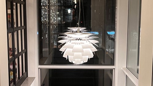 I den forrige uge kom to danske elektrikere ned til Benediktekirken for at opsætte en helt ny hvid PH Koglelampe i kirkens trappeopgang. Lampen er Poul Henningsens berømte lampe fra 1958 skabt til restaurant Langelinie Pavillionen i København. En ikonisk dansk lampe konstrueret og designet af lysmageren Poul Henningsen til at sprede så meget lys som muligt uden samtidigt at blænde folk.
