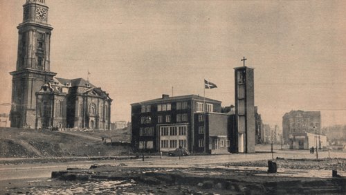 Hvis man vil vide lidt mere om, hvad det var for et Hamborg som kirken blev indviet i, så kan man lytte til denne fantastiske radiomontage (link nedenfor) fra 1953 af Danmarks Radios dygtige journalist Willy Reunert. Montagen handler om Hamborg havn og et efterkrigstids Hamborg, der bogstaveligttalt rejser sig af byens udbrændte ruiner i et forrygende tempo. Det er meget malende og et meget flot radioprogram.