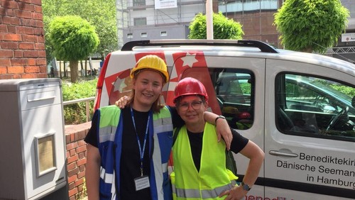 Duckdalben, er en sømandsklub som er bestyret af den tyske sømandsmission som vi arbejder tæt sammen med i forbindelse med vores arbejde på havnen. Birgitte og jeg skulle også ned forbi for at aflevere de sikkerhedssko, som jeg havde lånt til lille Birgitte for vi har kun violinkasser herinde. Derude mødte vi en af sømandsdiakonerne, en af vores gode venner og han bød på en (meget tiltrængt) kold sodavand i aftensolen. Her havde vi endnu en god snak, hvorefter vi fortsatte vores lille færd ud mod Altenwerder.