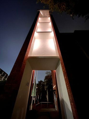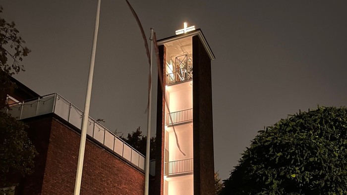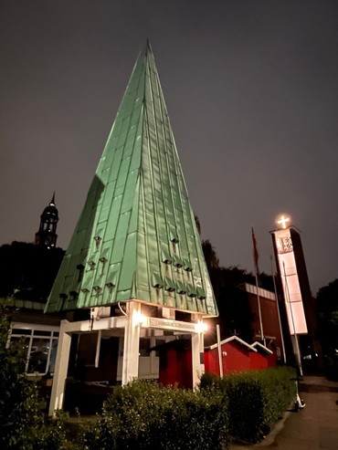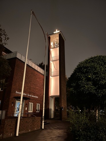 Nu stråler korset i kirken igen - for første gang i de snart 5 år Anne og jeg og drengene har boet her i kirken. Det er en stor dag - eller rettere nat i Ditmar-Koel-Straße. Neonen i korset er godt nok udskiftet med det mere moderne og energisparende LED, men korset stråler atter igen, og det hilser både søfolk, vores menighed og vores gæster velkommen til sømandskirken og velkommen til weekendens 150års jubilæum. Det er fantastisk, at vi nåede så langt med renoveringen her lige op til det store jubilæum.