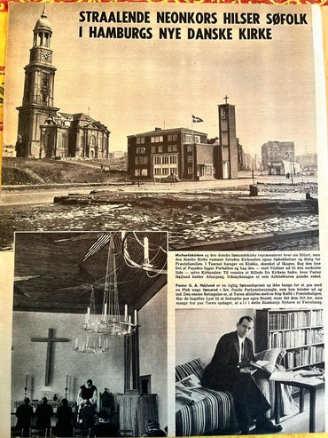"DET STRÅLENDE NEONKORS HILSER SØFOLK I HAMBURGS NYE DANSKE KIRKE" stod der med store bogstaver i Billedebladet for 73 år siden, da vores sømandskirke blev indviet.